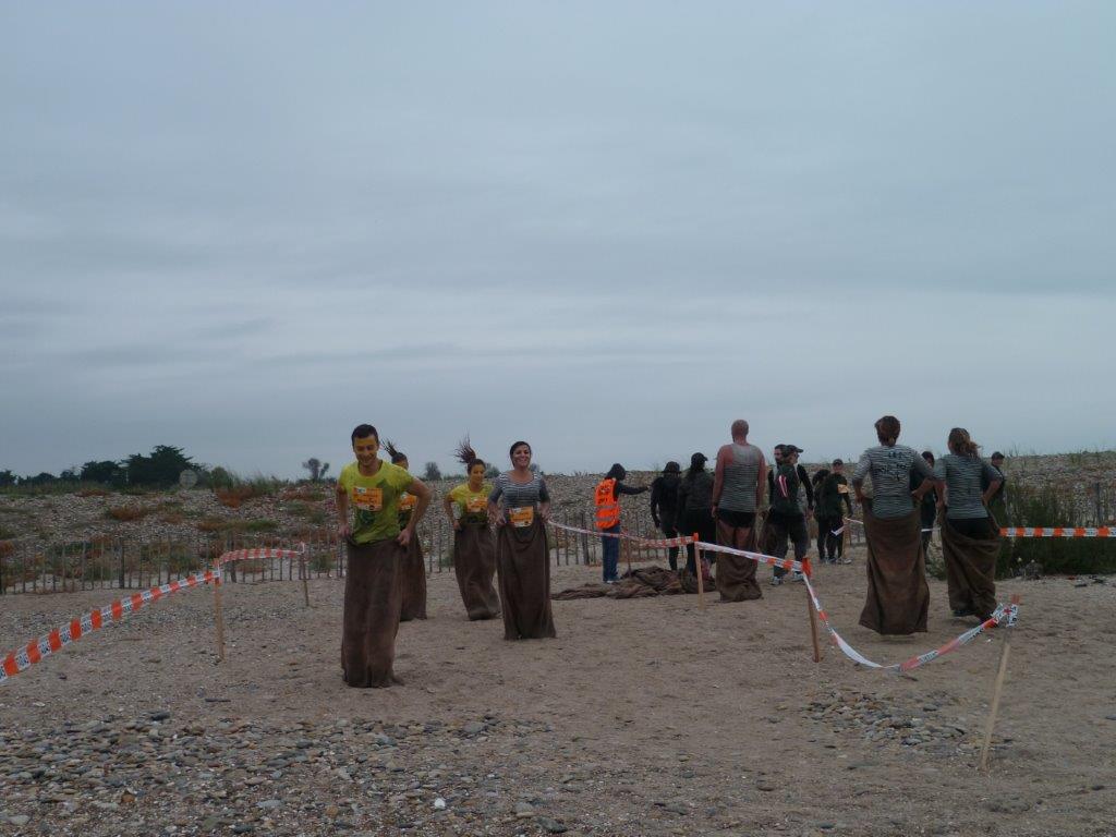 Sur la plage de Villeneuve-lès-Maguelone, une petite course en sac attendait les concurrents de la seconde édition de la ruée des fadas de Palavas-les-Flots, le dimanche 18 octobre 2015. Copyright : Edouard Paris