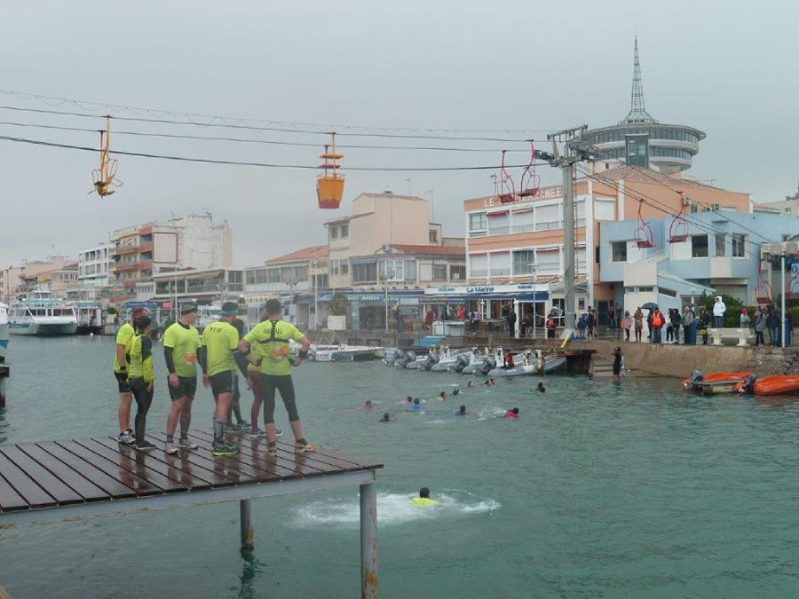Pour passer de la rive droite à la rive gauche, les concurrents de la seconde édition de la ruée des fadas de Palavas-les-Flots doivent nager dans le chenal du port de pêche, le dimanche 18 octobre 2015. Copyright : Edouard Paris