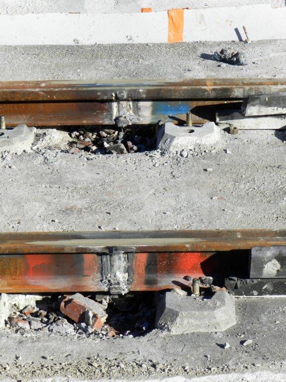 Zoom sur les deux dernières soudures de rails réalisées sur la partie nord du boulevard du Professeur Louis-Vialleton à Montpellier, à la hauteur de la place d’Aviler, le vendredi 23 octobre 2015. Copyright : Anje34