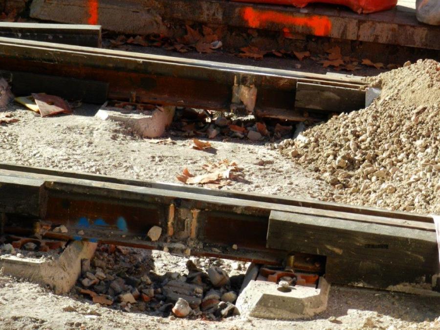 Gros plan sur les deux dernières soudures de rails réalisées sur le haut du boulevard Henri IV à Montpellier, au débouché de la rue Jean-Jacques-Rousseau, le vendredi 23 octobre 2015. Copyright : Anje34