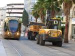 - Dans le bas du boulevard du Jeu-de-Paume à Montpellier, l’engin de chantier, en charge de la destruction d’une bonne longueur de trottoir côté numéros impairs, doit laisser le passage libre aux rames de tramway des lignes 3 et 4 entre deux pelletées. Photo prise le mercredi 21 octobre 2015. Copyright : Anje34