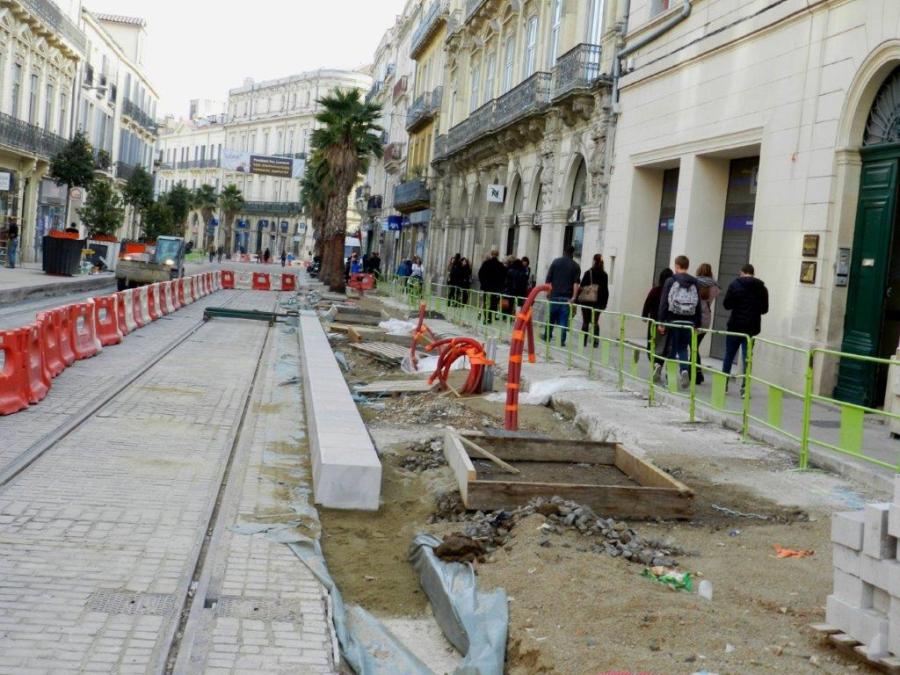 Boulevard du Jeu-de-Paume à Montpellier, avancement des travaux du quai en cours de construction à la hauteur de la boutique Nespresso, le jeudi 29 octobre 2015. Copyright : Anje34