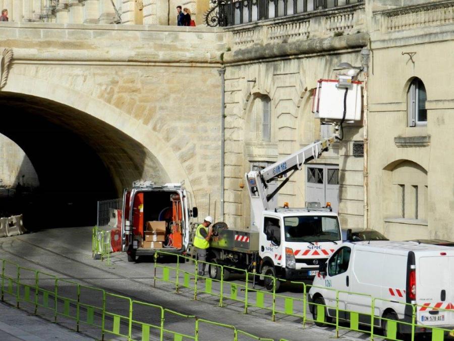 Boulevard du Professeur Louis-Vialleton à Montpellier, fixation en façade d’un candélabre destiné à l’éclairage public. Photo prise le jeudi 29 octobre 2015. Copyright : Anje34