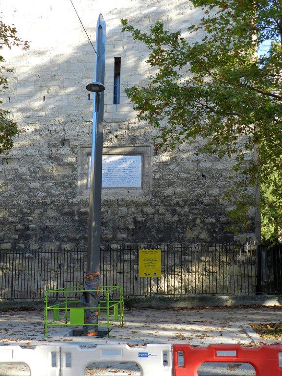 Un panneau de permis de construire a été fixé sur une grille située au pied de la Tour des Pins, boulevard Henri IV à Montpellier. Photo prise le vendredi 6 novembre 2015. Copyright : Anje34