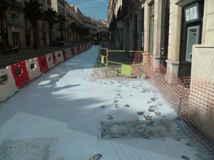 Dans le bas du boulevard du Jeu-de-Paume, un défaut de signalisation quelques mètres plus haut est à l’origine du piétinement du béton désactivé fraîchement coulé le lundi 9 novembre 2015. Copyright : Edouard Paris