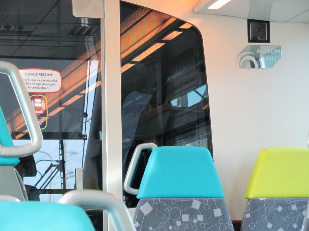 Dans le coin droit de la photo prise le samedi 31 octobre 2015, la plaque du constructeur et l’année de fabrication de la rame TT 113 Citadis Dualis Alstom. Copyright : Edouard Paris