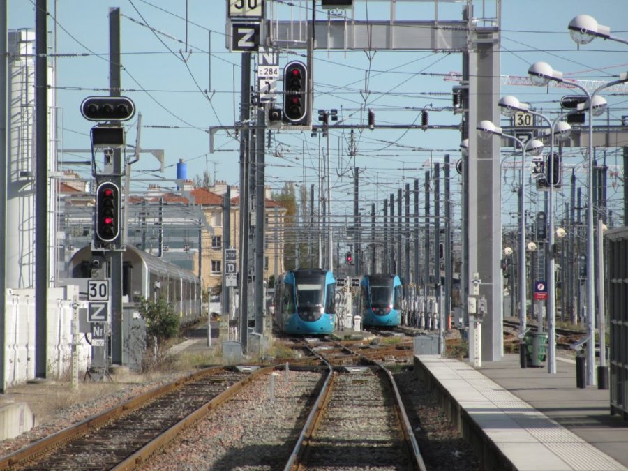 Au départ de la gare de Nantes, les rames trams-trains de la ligne T1 circulent sous des lignes aériennes de contact alimentées en courant alternatif monophasé 25 kV 50 Hz. Photo prise le samedi 31 octobre 2015. Copyright : Edouard Paris