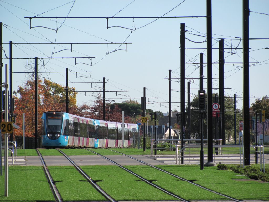 Un binôme composé des rames TT 124 et TT 117 Citadis Dualis Alstom, à destination de Châteaubriant, approche de la station « Haluchère-Batignolles », le samedi 31 octobre 2015. Copyright : Edouard Paris