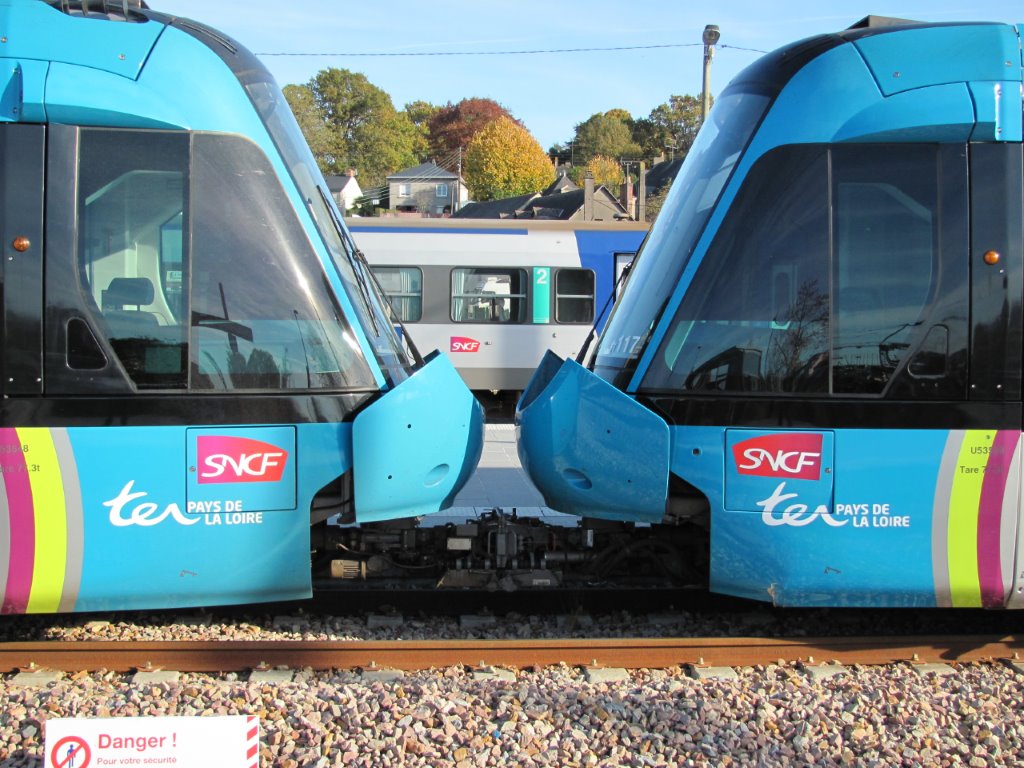 Gros plan sur les attelages automatiques du binôme composé des rames TT 124 (à gauche) et TT 117 (à droite) Citadis Dualis Alstom, en gare de Châteaubriant, le samedi 31 octobre 2015. Copyright : Edouard Paris