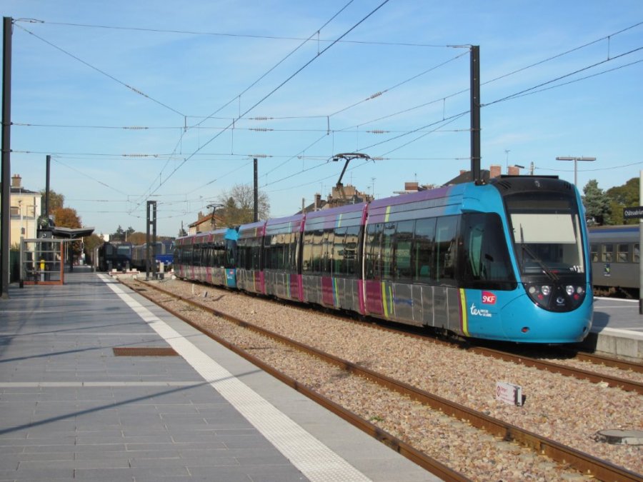 Un binôme composé des rames TT 117 et TT 124 Citadis Dualis Alstom est photographié en gare de Châteaubriant, terminus de la ligne T1 de tram-train, le samedi 31 octobre 2015. Copyright : Edouard Paris