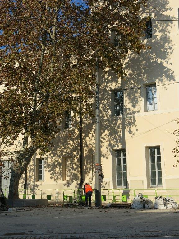 Photographie d’un des premiers mâts installés sur la place Albert 1er à Montpellier dans le cadre du chantier de bouclage de la ligne 4 de tramway, le vendredi 13 novembre 2015. Copyright : Edgar Chaptal