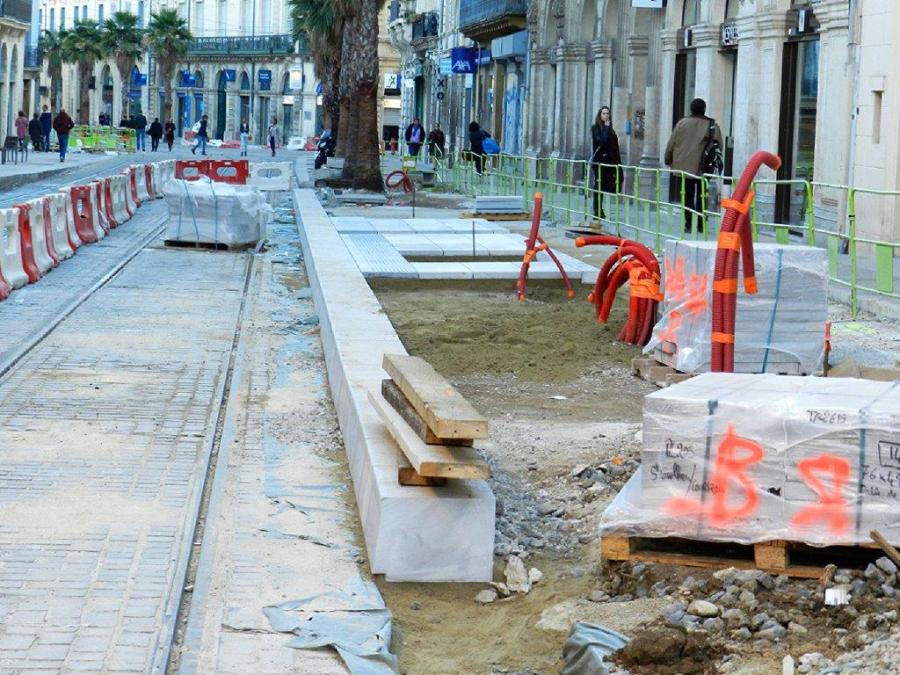 Aperçu de l’avancement du chantier de construction d’un des quais de la future station « Saint-Guilhem – Courreau » à la hauteur de la boutique Nespresso, boulevard du Jeu-de-Paume à Montpellier, le jeudi 12 novembre 2015. Copyright : Anje34