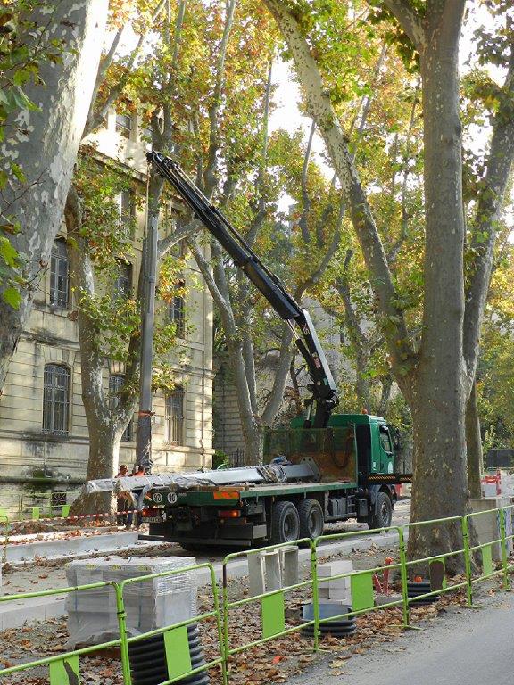 Installation d’un mât auquel sera fixé un câble transversal support de lignes aériennes de contact dans le bas du boulevard Henri IV à Montpellier, le jeudi 12 novembre 2015. Copyright : Anje34