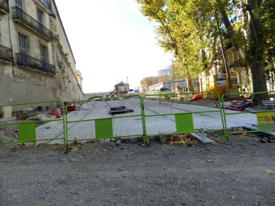 Au premier plan, la chaussée constituée de tout-venant, qui dessert le 1 boulevard du Professeur Louis-Vialleton, est amenée à disparaître au cours de la dernière semaine du mois de novembre pour faire place à la pose des pavés. Photo prise le samedi 21 novembre 2015. Copyright : Anje34