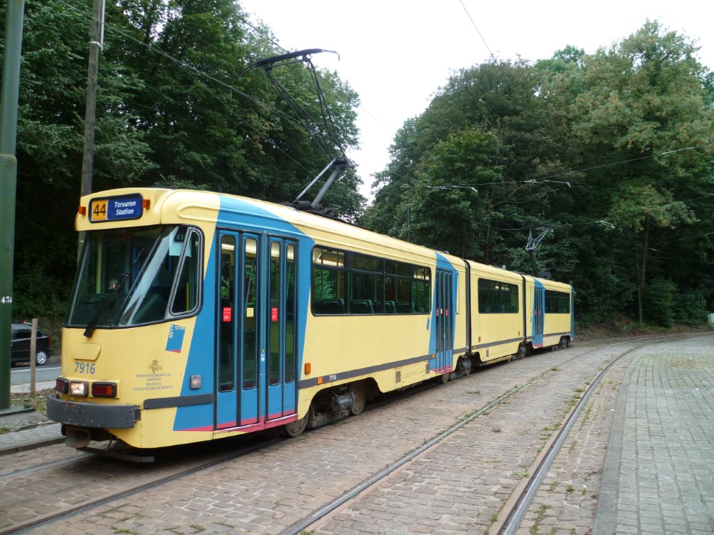 Motrice triple caisse bidirectionnelle n°7916 (année 1977 – constructeur BN/ACEC) est photographiée sous livrée ancienne au terminus « Tervuren » de la ligne 44 du réseau de tramways de Bruxelles-capitale, commune de Tervuren, région flamande, le dimanche 19 septembre 2010. Copyright : Edouard Paris