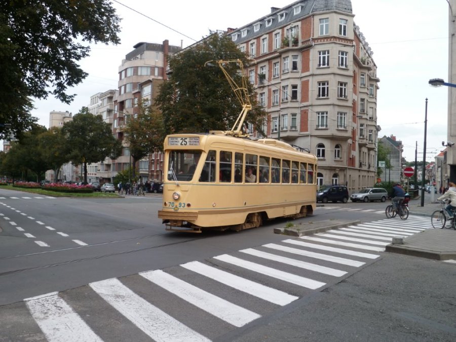 A l’occasion du 125ème anniversaire de l’Union Internationale des Transports Publics (UITP) la motrice PCC unidirectionnelle n°7093, construite en 1958 avec des équipements d’occasion provenant de Kansas City, traverse l’avenue de Broqueville, commune de Woluwe-Saint-Pierre, région de Bruxelles-capitale, le dimanche 19 septembre 2010. Copyright : Edouard Paris