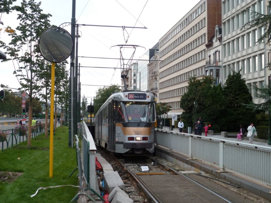 La motrice double caisse bidirectionnelle n°7807 (année 1972 – constructeur BN/ACEC), opérant sur la ligne 39 en direction du terminus « Ban Eik », est photographiée avenue de Tervuren, commune de Woluwe-Saint-Pierre, région de Bruxelles-capitale, à l’instant où elle sort de son terminus souterrain en boucle « Montgomery », le dimanche 19 septembre 2010. Copyright : Edouard Paris