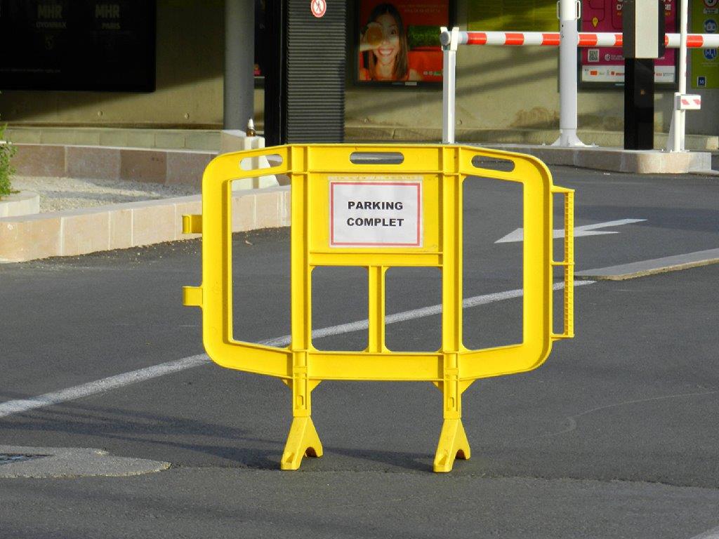 Gros plan sur la barrière installée quelques mètres avant l’entrée située au pied de la tour abritant les voies montantes et descendantes, où est affichée une feuille A4 indiquant « parking complet ». Photo prise le mardi 24 novembre 2015. Copyright : Anje34