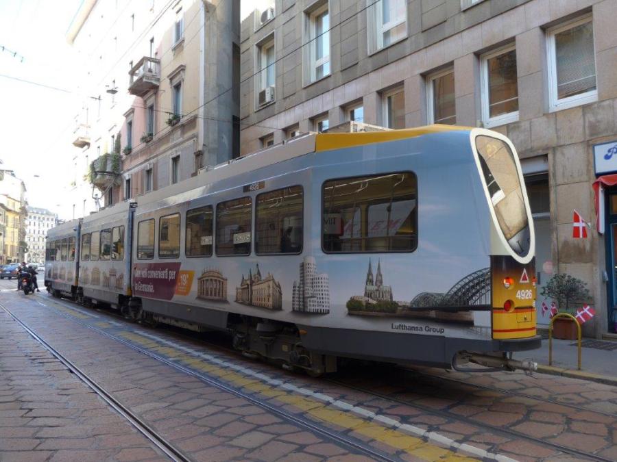 A Milan, la rame 4926 série 4900 Fiat Ferroviara, année de construction 1976, modernisée en 2012, arbore un pelliculage intégral Germanwings Eurowings. Photo prise à la hauteur du 16 via Meravigli, le lundi 19 octobre 2015. Copyright : Laure C