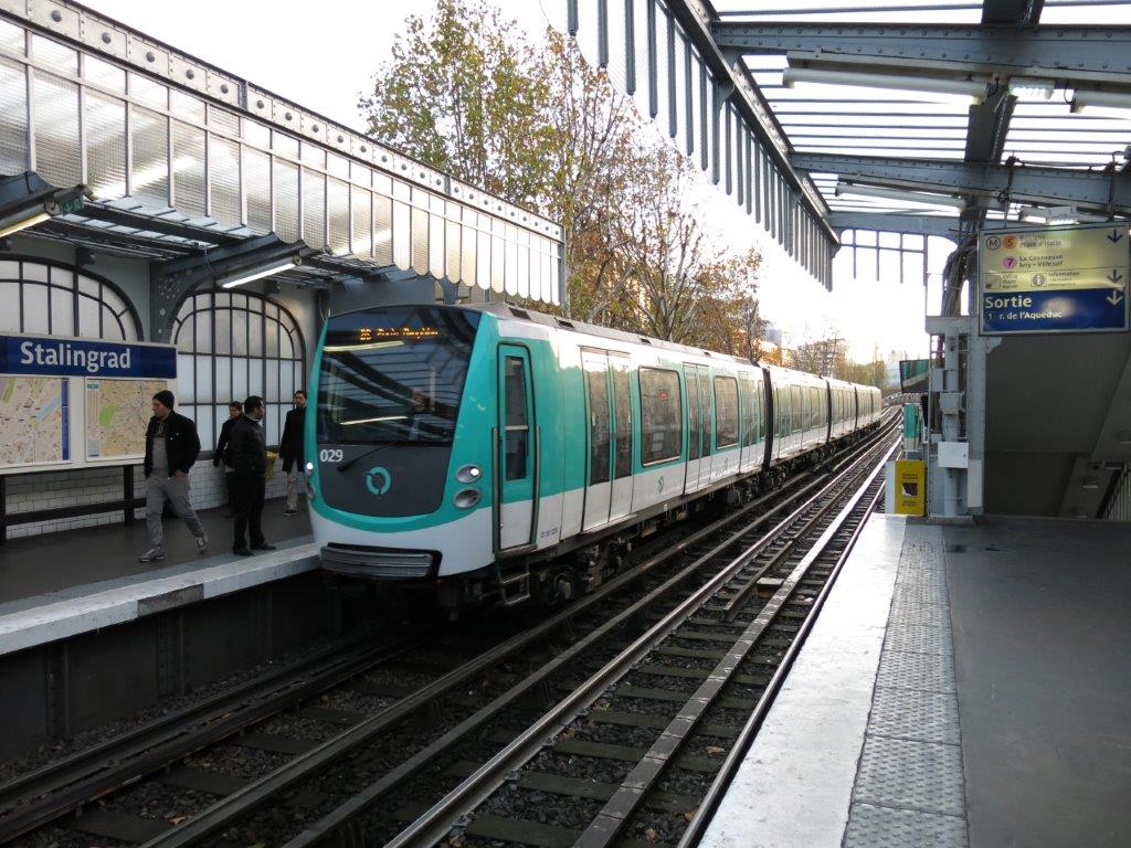 Transports en commun gratuits en Ile-de-France les dimanche 29 et lundi 30 novembre 2015. A Paris, la rame de la série MF 01 Bombardier Alstom numéro 029 (année 2010), circulant en direction du terminus nord-ouest « Porte Dauphine » de la ligne 2 de métro, est photographiée à son arrivée à la station aérienne « Stalingrad », le samedi 28 novembre 2015. Copyright : Edgar Chaptal