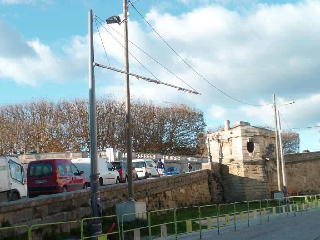 Sur la partie sud du boulevard du Professeur Louis-Vialleton, un mât a été équipé d’une potence qui sera orientée au-dessus des voies et à laquelle seront fixées les lignes aériennes de contact quand ces dernières seront déroulées. Photo prise le jeudi 26 novembre 2015. Copyright : Edouard Paris