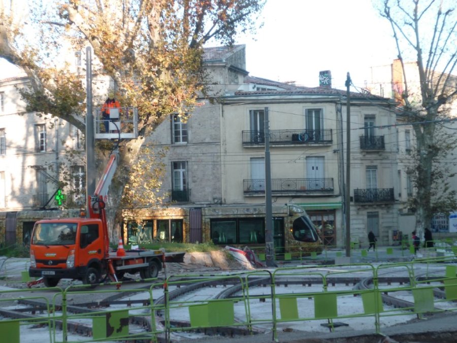 Le jeudi 26 novembre 2015, un technicien debout sur une nacelle télescopique était en train de fixer des câbles transversaux à un mât érigé à côté des deux platanes préservés de la place Albert 1er à Montpellier. Copyright : Edouard Paris