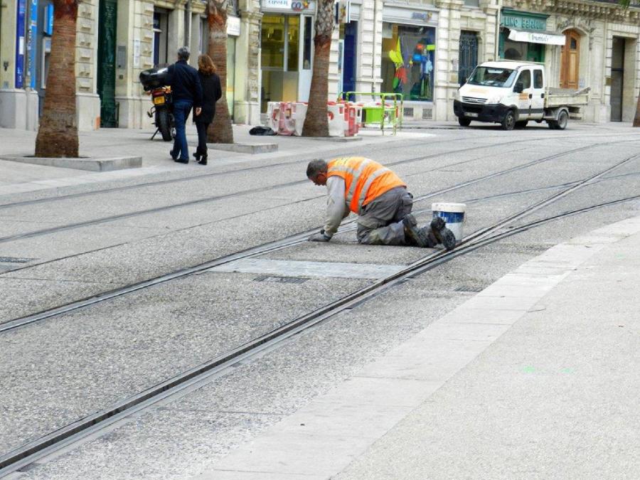 Nettoyage d’une des deux aiguilles d’un appareil de voie boulevard du Jeu-de-Paume à Montpellier, le jeudi 3 décembre 2015, entre le passage des rames des lignes 3 et 4 en direction de la rue André-Michel. Copyright : Anje34
