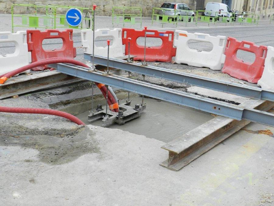 A la limite des boulevards Ledru-Rollin et du Professeur Louis-Vialleton à Montpellier, vue sur la fixation où sera érigé un mât support de lignes aériennes de contact. Photo prise le jeudi 3 décembre 2015. Copyright : Anje34
