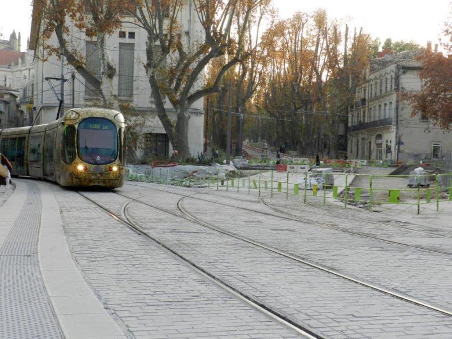 Place Albert 1er à Montpellier, photographie de la bifurcation en direction du boulevard Henri IV peu après la station « Place Albert 1er », le vendredi 4 décembre 2015. Copyright : Anje34