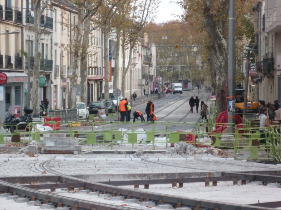 Boulevard Pasteur à Montpellier, une équipe vérifie un appareil de voie installé au cours de l’été 2015 dans le cadre du chantier de bouclage de la ligne 4 de tramway, le jeudi 3 décembre 2015. Copyright : Edouard Paris