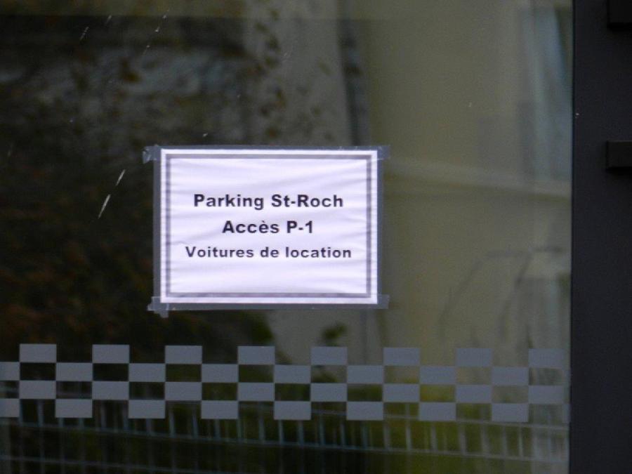 Rue Alexandra David-Néel à Montpellier, niveau 0 du parking Saint-Roch, une affiche apposée sur une porte vitrée indique une des deux cages d’escaliers qui donnent accès au seul niveau P-1. Photo prise le mardi 8 décembre 2015. Copyright : Anje34
