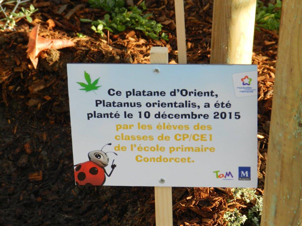 Gros plan sur un écriteau placé au pied d’un des neufs platanes d’orient plantés boulevard Henri IV à Montpellier, les mercredi 9 et jeudi 10 décembre 2015. Photo prise le samedi 12 décembre 2015. Copyright : Anje34