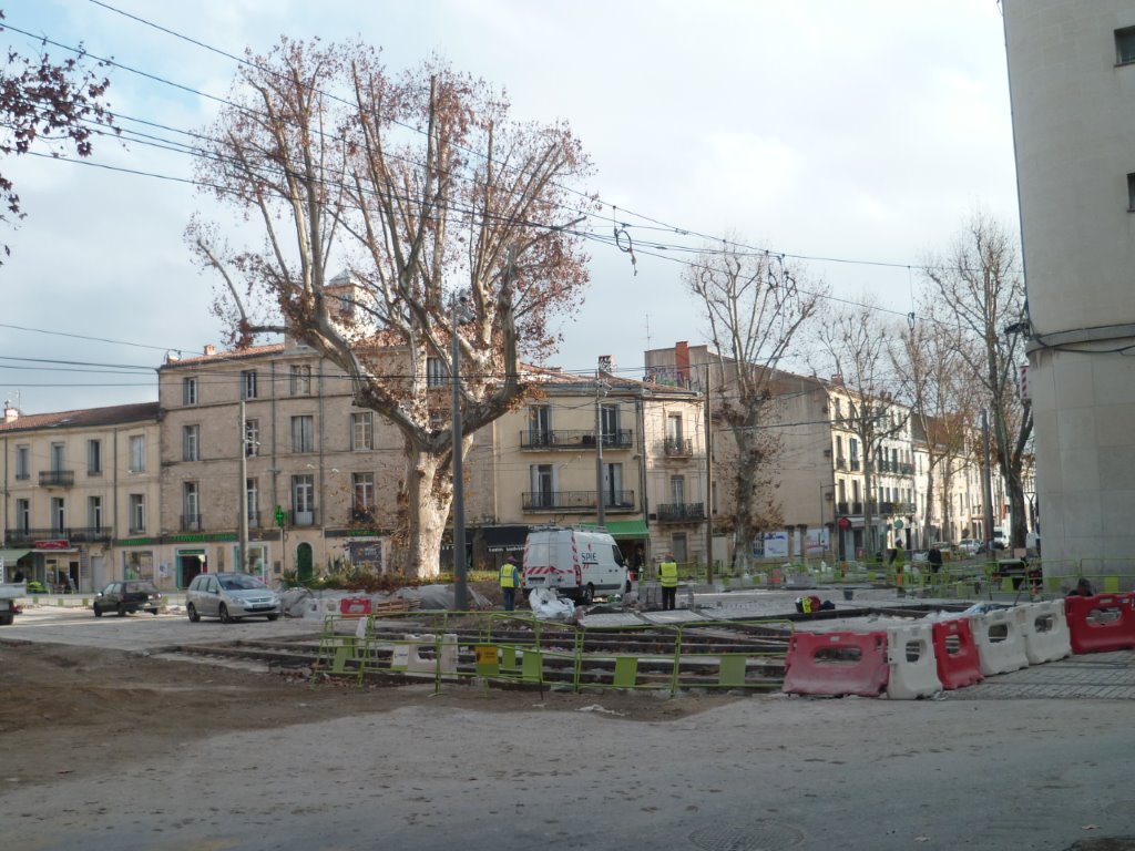 Place Albert 1er à Montpellier, le chantier de pose de pavés se poursuivait le lundi 14 décembre 2015. Copyright : Edouard Paris