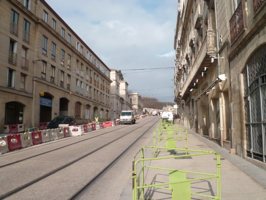 Boulevard Ledru-Rollin à Montpellier, les travaux de réalisation du futur trottoir élargi côté numéros pairs se poursuivaient le lundi 14 décembre 2015. Copyright : Edouard Paris