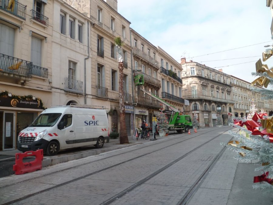 Le lundi matin 14 décembre 2015, travaux sur façade en relation avec le chantier de bouclage de la ligne 4 de tramway sur le haut du boulevard du Jeu-de-Paume à Montpellier. Copyright : Edouard Paris