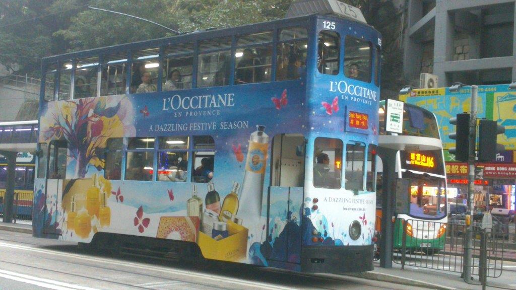 Motrice 125 du tramway électrique de Hong Kong à la livrée L’Occitane en Provence photographiée en fin d’après-midi, le vendredi 18 décembre 2015. Copyright : DS7