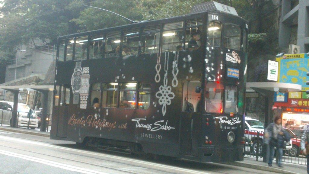 Motrice 114 du tramway électrique de Hong Kong à la livrée Thomas Sabo photographiée en fin d’après-midi, le vendredi 18 décembre 2015. Copyright : DS7