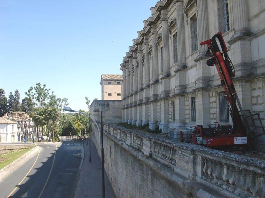 Le dimanche 1er juin 2014, une première foreuse était stationnée sur la coursive extérieure du Palais de Justice de Montpellier en vue d’y effectuer des carottages le lendemain. Copyright : Louis Ferdinand