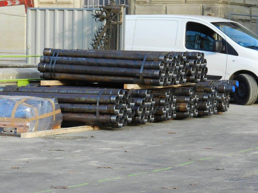 Stock de pieux en acier destinés à être mis en sol par forage. Photo prise au pied de l’Arc de Triomphe de Montpellier, le lundi 14 décembre 2015. Copyright : Anje34