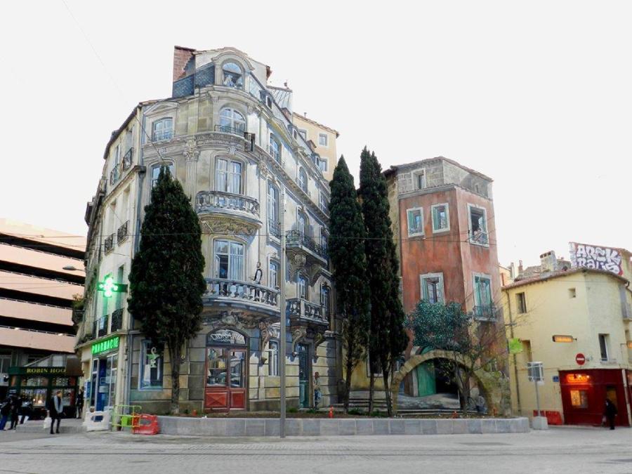 Place Edouard-Adam à Montpellier, un mât a été érigé devant la fresque murale trompe-l’œil. Photo prise le vendredi 18 décembre 2015. Copyright : Anje34