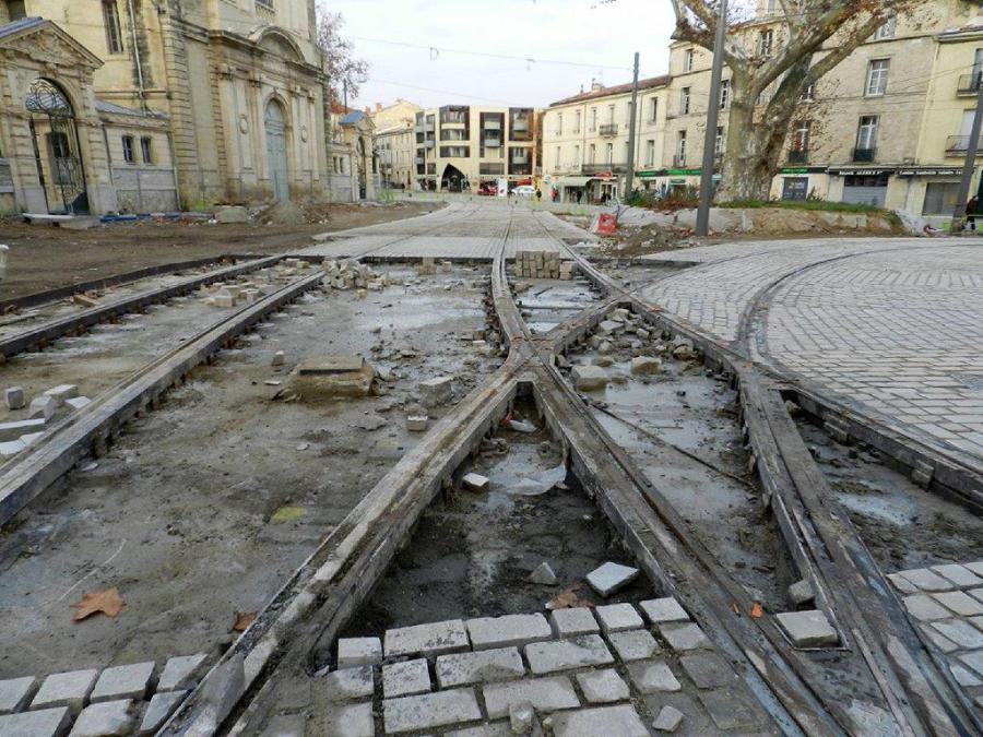 Calme plat sur le chantier de bouclage de la ligne 4 de tramway, place Albert 1er à Montpellier, le vendredi 18 décembre 2015 après-midi. Copyright : Anje34