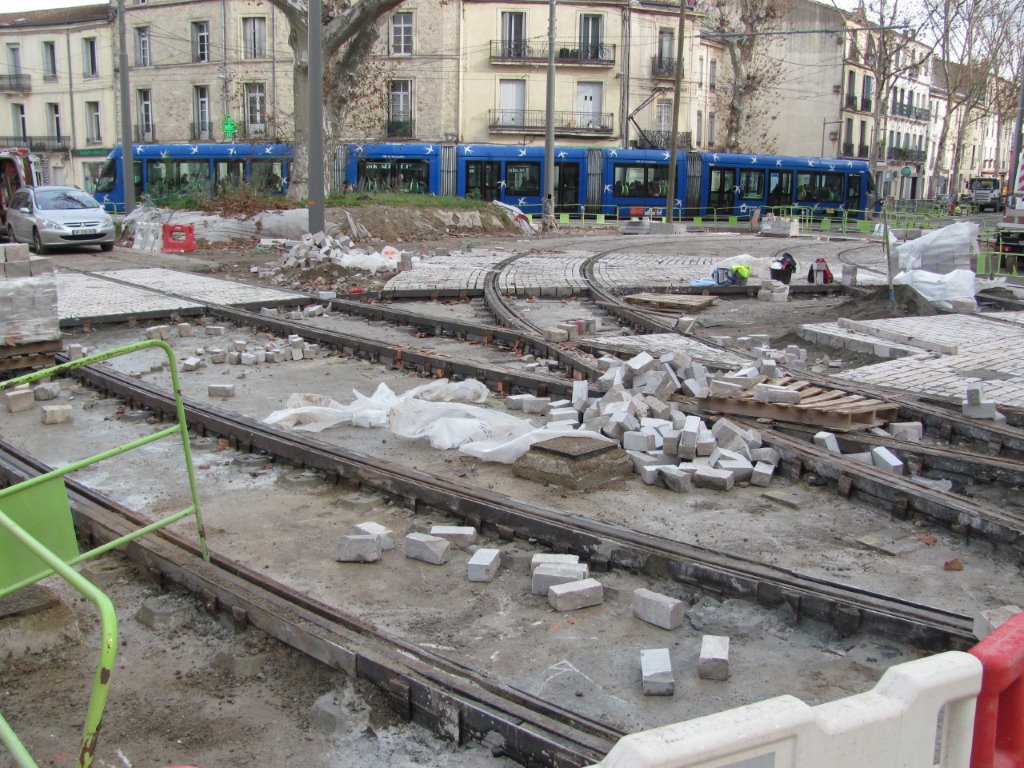 Chantier de la pose de pavés, place Albert 1er à Montpellier, le mercredi 16 décembre 2015. Copyright : Edouard Paris