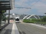 - La rame 848 Citadis 302 Alstom approche de la station du T1 « Halle Tony Garnier ». En arrière plan : le pont Raymond-Barre à droite et le Musée des Confluences au centre. Photo prise le samedi 16 mai 2015. Copyright : Edouard Paris
