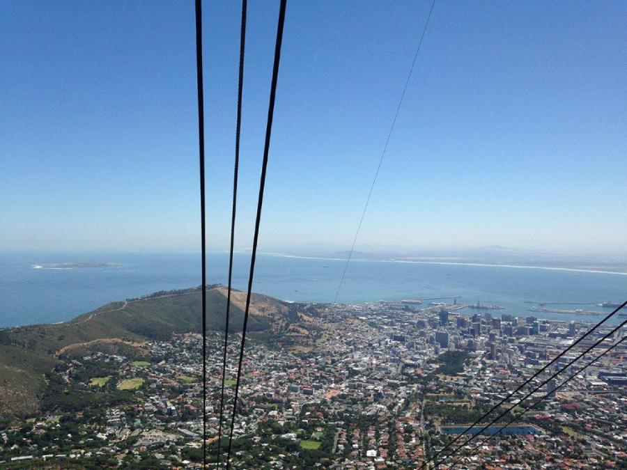 Vue panoramique sur Cape Town et ses environs depuis une des deux cabines du téléphérique de la montagne de la Table. Photo prise le mardi 29 décembre 2015. Copyright : Karine D
