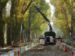 - Photo remarquable de l’installation d’un mât auquel sera fixé un câble transversal support de lignes aériennes de contact dans le bas du boulevard Henri IV à Montpellier, le jeudi 12 novembre 2015. Copyright : Anje34