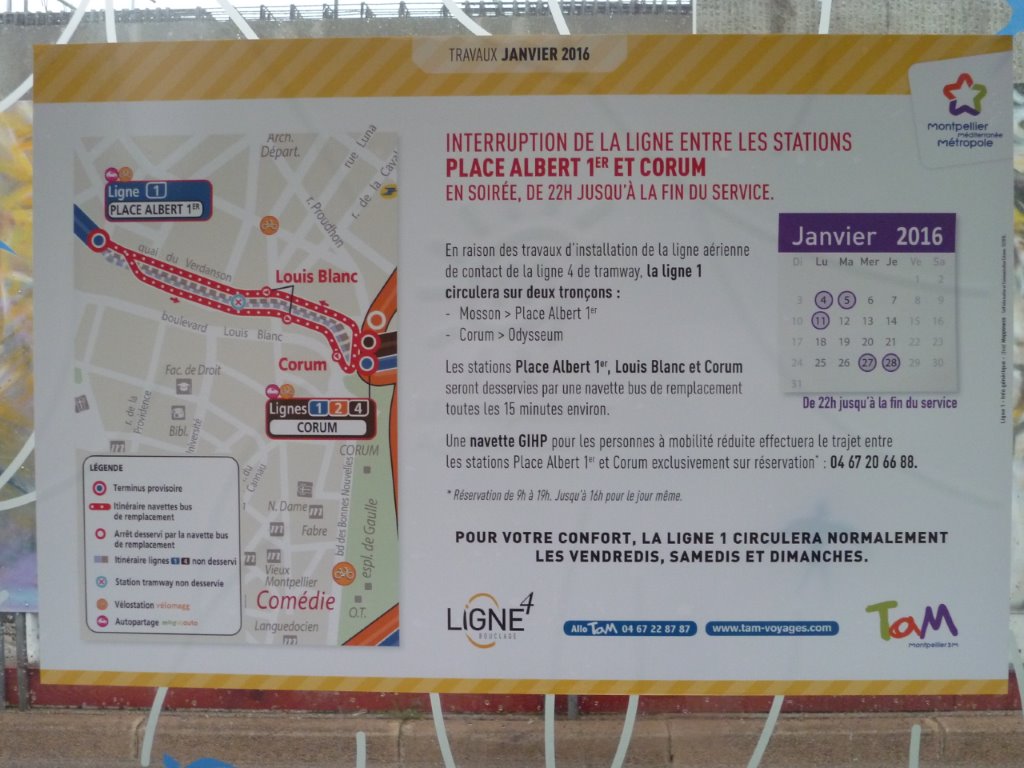 Information sur les perturbations nocturnes concernant la ligne 1 de tramway au cours du mois de janvier 2016 photographiée à la station « Stade Philippidès », le jeudi 31 décembre 2015. Copyright : Edouard Paris
