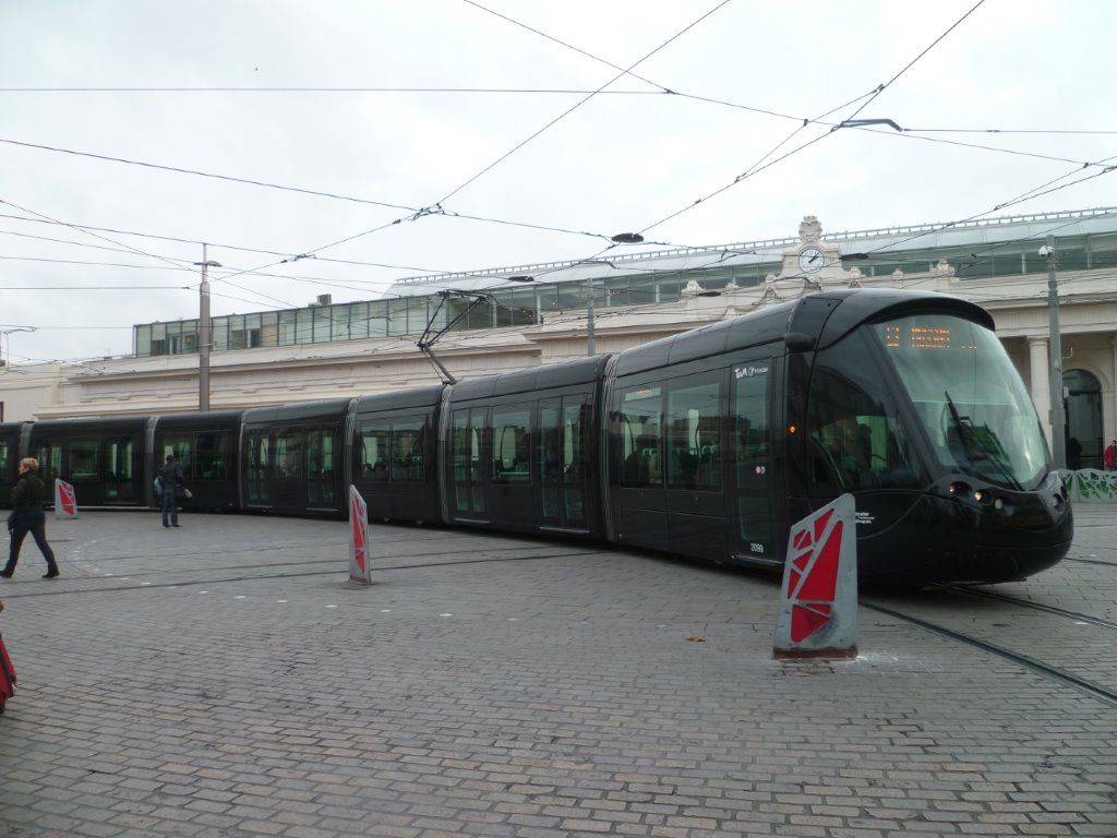 La livrée noire des rames multilignes, ici la 2099 Citadis 402 Alstom, annonçait en fait la fin du tout-tramway. Photo prise place Auguste-Gibert à Montpellier, le samedi 26 décembre 2015. Copyright : Edouard Paris