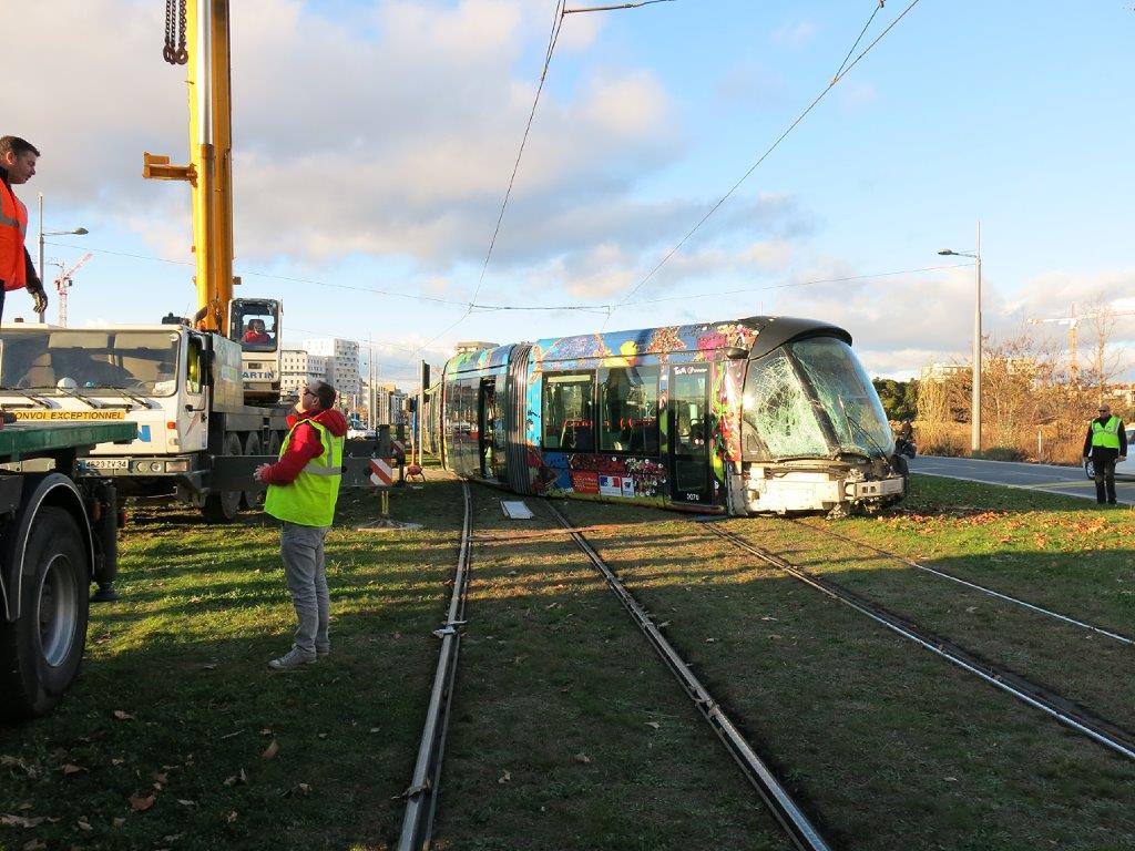 Autre photo d’une motrice de la rame 2070 Citadis 402 Alstom sortie des rails à la suite d’une collision avec un camion de l’entreprise Nicollin à 13h30 environ, au sud-est de la station « Pablo Picasso », le mercredi 6 janvier 2016. Copyright : Edgar Chaptal