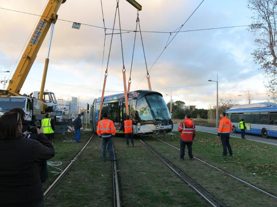 Après avoir été sanglée, la motrice accidentée de la rame 20270 Citadis 402 Alstom est soulevée par la grue hydraulique de l’entreprise Martin, en fin d’après-midi du mercredi 6 janvier 2016. Copyright : Edgar Chaptal