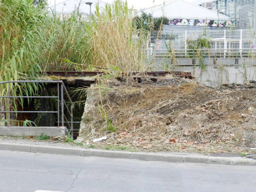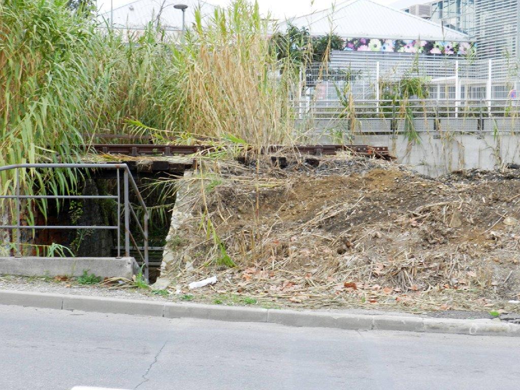 Rue de Cholet à Montpellier, bout de voie ferrée de l’ancienne ligne Montpellier – Paulhan photographié à la hauteur de l’enseigne Baobab, le dimanche 3 janvier 2016. Copyright : Anje34